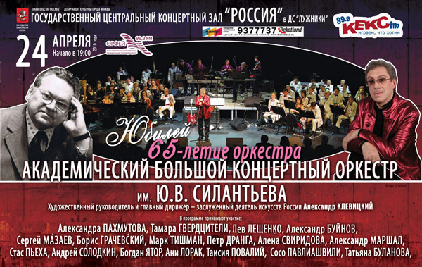 24 апреля во Дворце Спорта "Лужники" радио «Орфей» и Государственный центральный концертный зал «Россия» представляют Академический Большой концертный оркестр им. Юрия Силантьева в юбилейной программе - "65 лет лучшему оркестру отечественной эстрады".