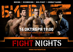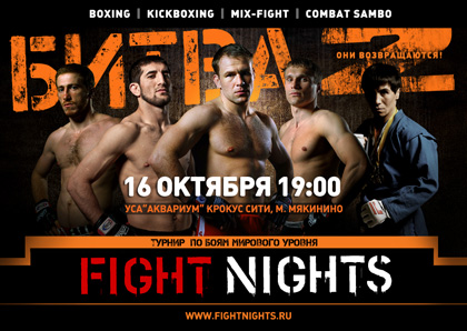 16 октября на УСА «Аквариум» Крокус–Сити состоится уникальное бойцовское шоу «Битва под Москвой 2» серии FIGHT NIGHTS. В рамках спортивной программы состоятся 12 боев по кикбоксингу,профессиональному боксу, боевому самбо, микс-файт и панкратиону.