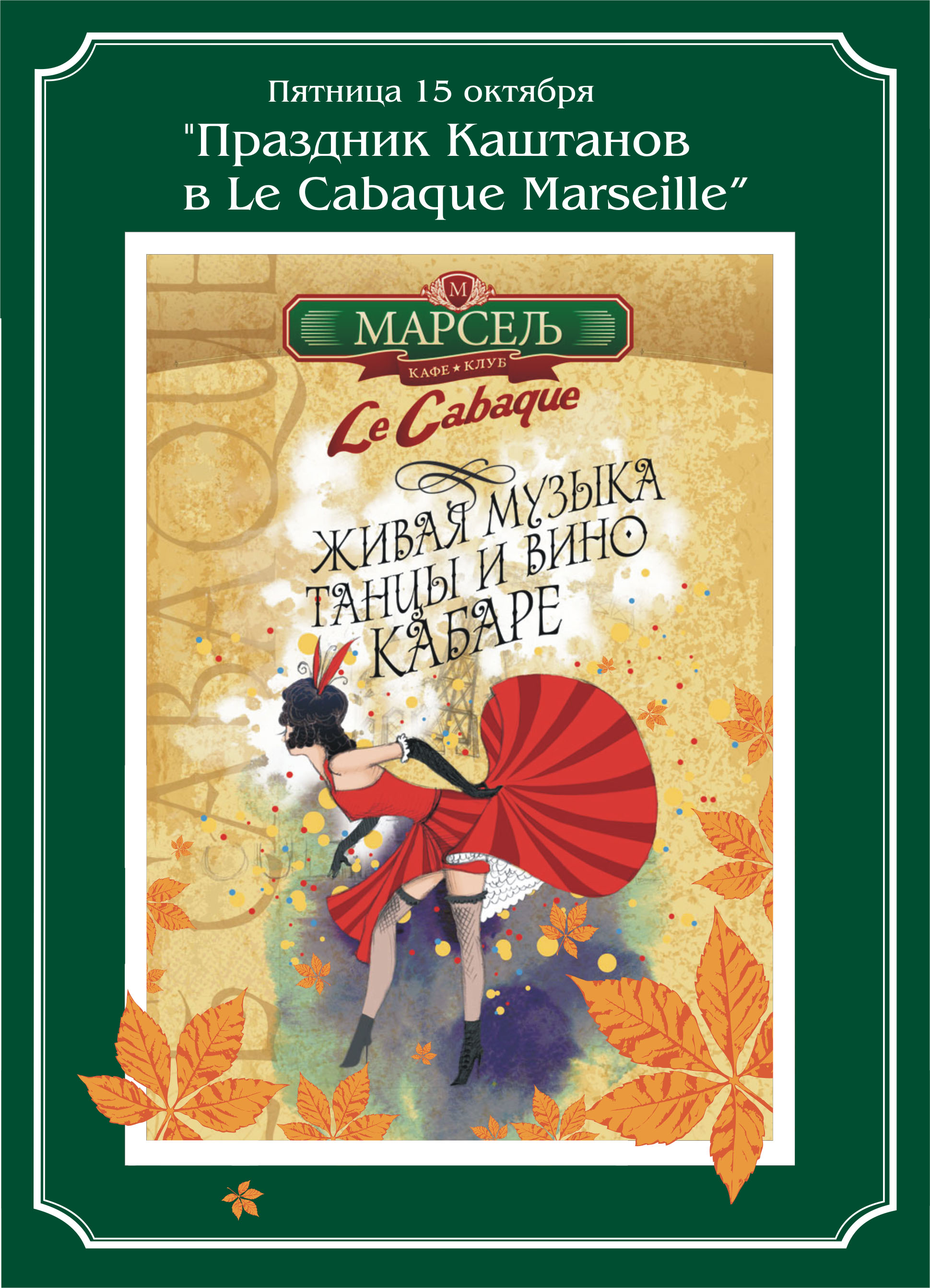 В пятницу, 15 октября, с семи вечера и до поздней ночи на вечеринке Le Cabaque Marseille мы будем кутить так, как этого требует душа любого уважающего себя горожанина в такой сакраментальный день, как пятница! За будоражащее воображение любого gourmet вечернее le menu в ответе - наш маэстро шеф-повар Владимир Годачев и его специальное меню в честь народного праздника Франции - Дня Каштанов!
