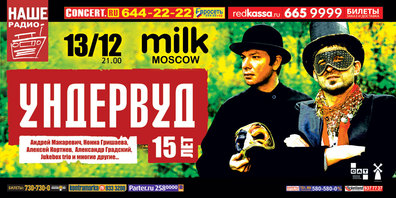 Группа «Ундервуд» готовится отметить свое 15-летие. Вместе с юбилярами 13 декабря на сцену московского клуба Milk выйдут их гости и друзья: Андрей Макаревич, Александр Градский, Алексей Кортнев, актриса Нонна Гришаева, трио Jukebox и многие другие.Зрители, пришедшие в клуб «Milk» 13 декабря, почувствуют себя гостями настоящего праздника! Вместе с «Ундервудом» и их друзьями – Андреем Макаревичем, Александром Градским, Алексеем Кортневым, Нонной Гришаевой, трио Jukebox и другими гостями - публика окунётся во все эпохи творчества коллектива.