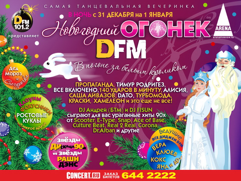 Вот это ДА! Вот это Хэппи Нью Йеа! DFM сходит с ума, и все мы вместе с ним! В самую-самую новогоднюю ночь, впервые в истории танцевальных вечеринок радио DFM перенесет нарядный Новогодний стол в клубный формат. Вас ждет только все лучшее и развеселое! Все герои легендарных фестивалей радио DFM D-скач 90-х и Рашн Дэнс зажгут вместе с вами на «Новогоднем Огоньке DFM» и радостно надерут уши белому кролику!