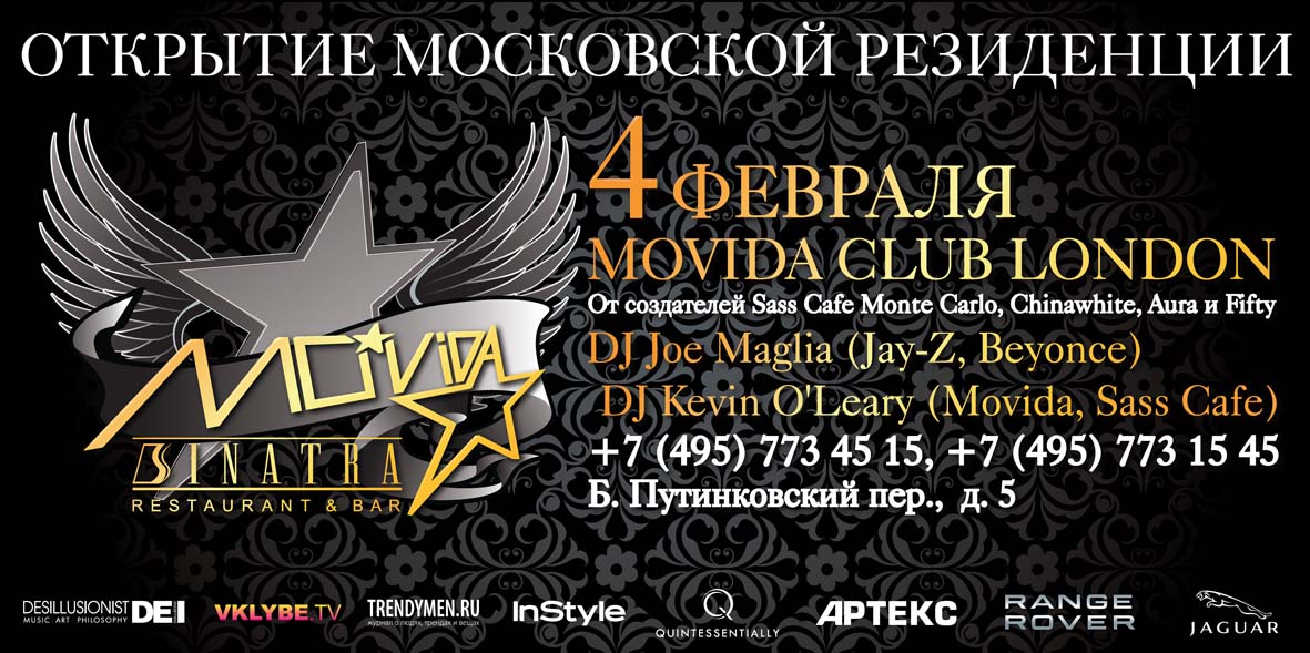 Легендарный лондонский клуб Movida - это детище трех самых знаковых персонажей направления Лондон-Монте Карло - Фрэд Мосс, Марк Мерран и Сами Сасс. Фрэд Мосс - создатель знаменитого Maddox. За плечами Марка Меррана – Chinawhite, Aura и Fifty, а концепция Movida - это работа легендарного Сами Сасса, основателя Sass Cafe в Монте Карло. Идея Movida проста: все, кто «в теме», зимуют в Лондоне, а отдыхают на Лазурном берегу. Теперь все те, кто прекрасно знает этот «маршрут», смогут наслаждаться привычно высокими стандартами клубной культуры и в Москве. Создатели Movida привезли в Sinatra Bar&Restaurant не только музыку и дизайн, но и собственный менеджмент – все для того, чтобы обеспечить требовательным гостям европейский уровень обслуживания.