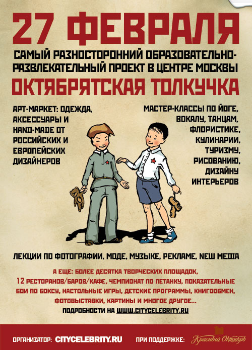 27 февраля территория "Красного Октября" превратится в зону лекториев, мастер-классов, показов, арт-маркетов, арт-проектов, кинопоказов, презентаций по фотографии и дизайну, моде и хэндмейду, путешествиям, кино и многому другому.