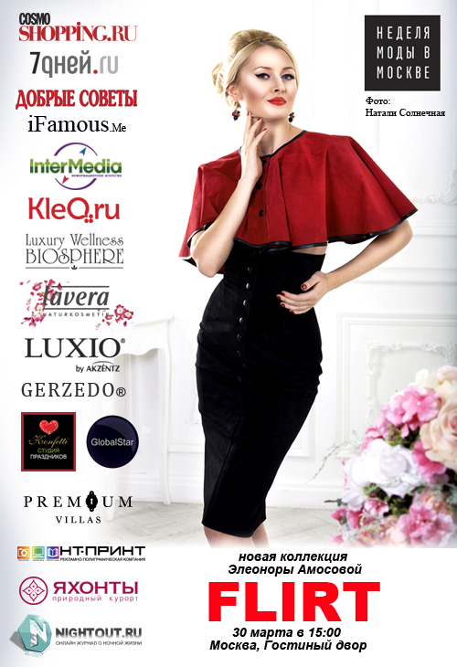 Коллекция «FLIRT» наполнена нарядами из тончайшей замши с кружевом, парчи и кожи с интересным и необычным принтом. Приталенные силуэты платьев с пышными юбками не оставят равнодушными ни одну модницу, и тем более ни одного мужчину. Никакой пошлости и вульгарности. Каждый наряд помогает заигрывать с мужчиной, уводя его в мир фантазии и мечты, но в тоже время создавая ощущение недоступности. Работая в классическом стиле, Элеонора Амосова создает одежду вне времени, необычайно женственную и элегантную.