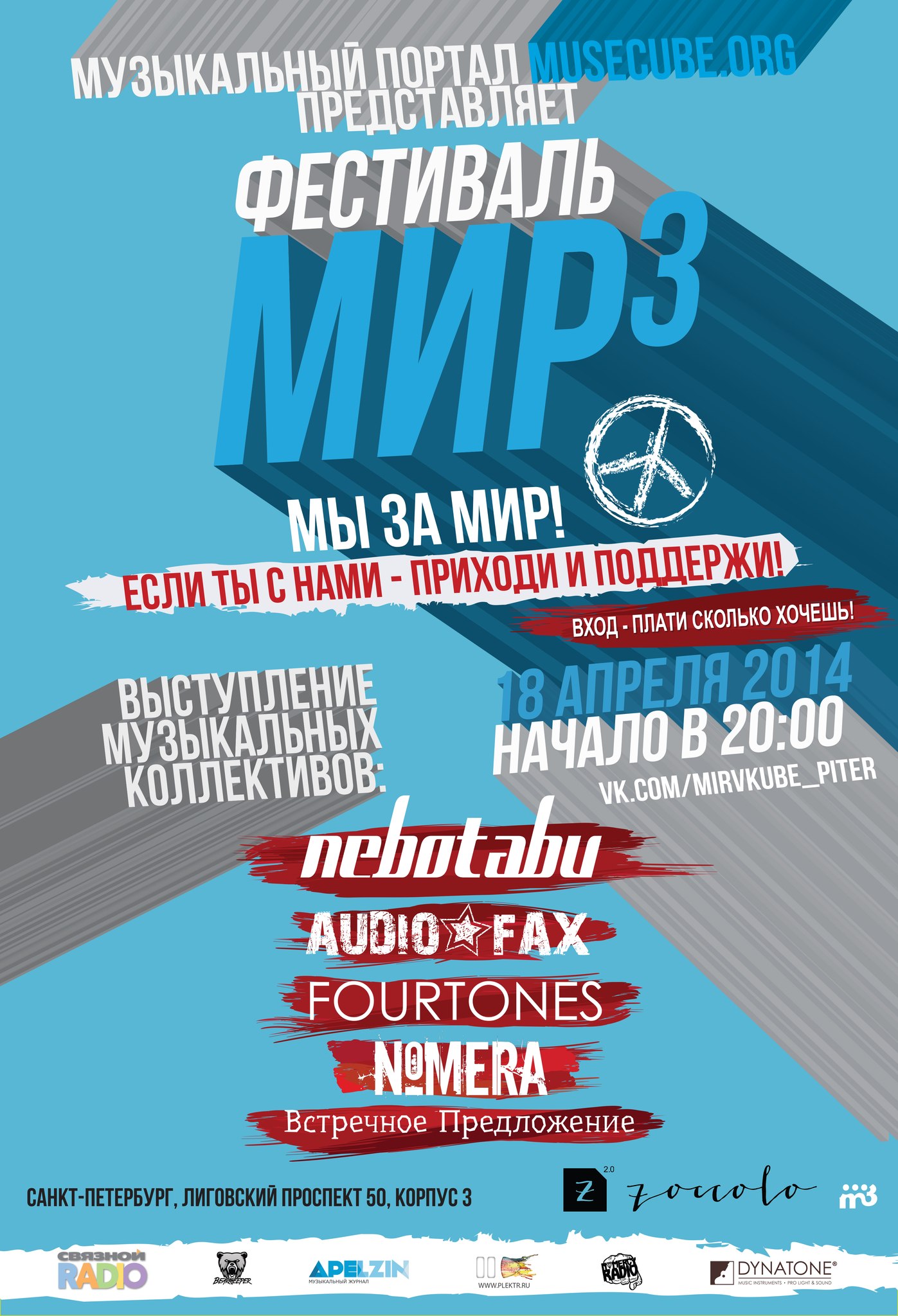 Всероссийский фестиваль "Мир в кубе", организованный музыкальным порталом MuseCube.org. В уютном клубе самого культурного города страны выступят группы из Санкт-Петербурга и Москвы, которые уверены в том, что музыка - это самый главный объединяющий фактор молодежи при нынешнем потоке новостей.