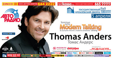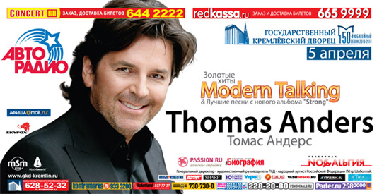 Именно в Государственном Кремлевском Дворце 5 апреля состоится сольный концерт Томаса Андерса. Артист представит программу, в которую войдут как золотые хиты «Modern Talking», так и композиции с нового сольного альбома певца «Strong», который был записан специально для отечественного медиа-рынка и вышел в свет в марте 2010 года на лейбле CD LAND Group.