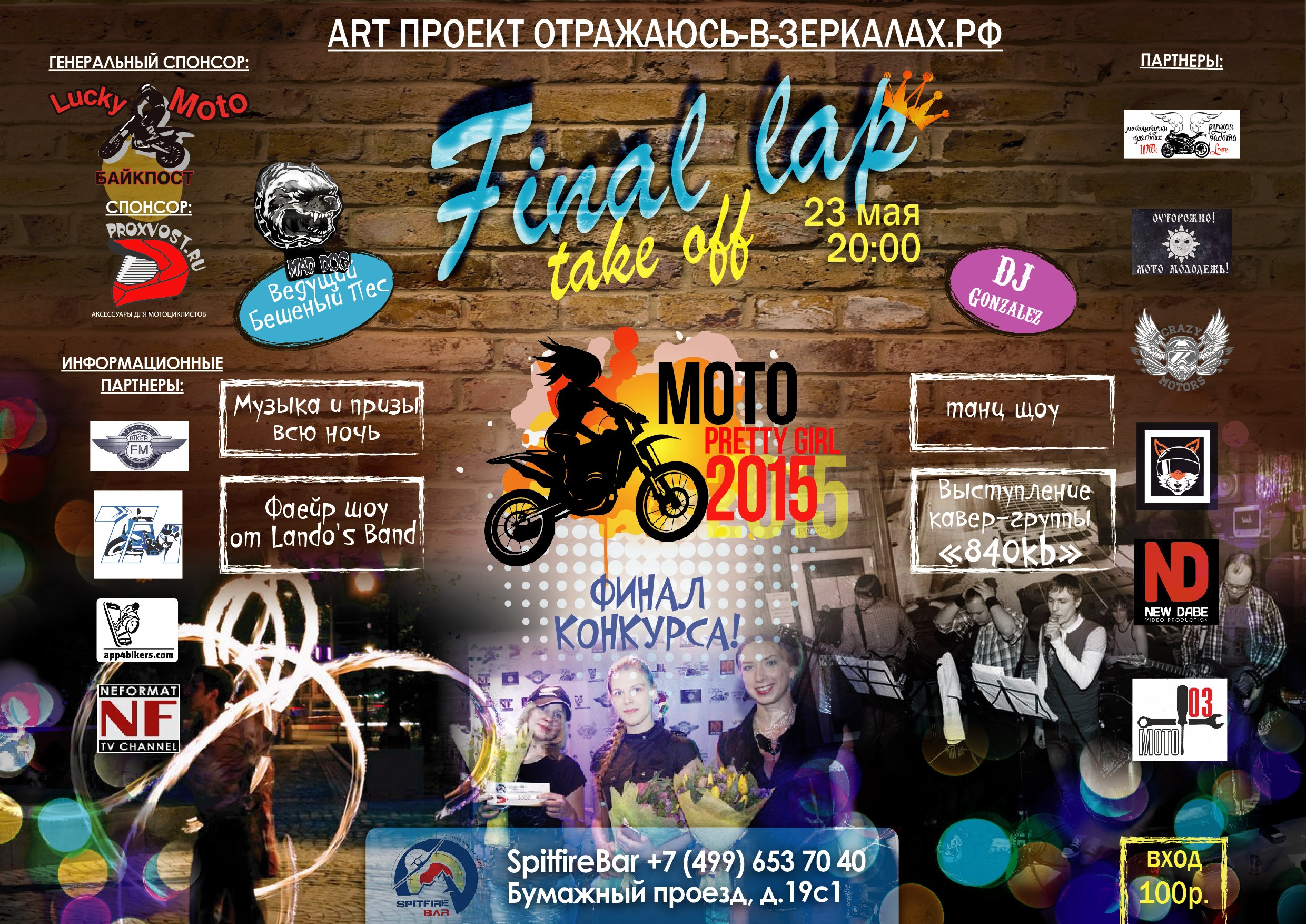 В рамках ART проекта «Отражаюсь-в-зеркалах» 22 января 2015 г. стартовал конкурс красоты среди мотомолодежи «MOTO PRETTY GIRL – 2015». На протяжении трех месяцев на интернет площадке и в баре SpitFire проходят отборочные этапы конкурса. Девушки соревнуются друг с другом, активно демонстрируя свои таланты и навыки, рассказывая о себе и своих увлечениях. Гостей мероприятия радует яркая шоу программа, с интересным ведущим и множеством сюрпризов. Финал состоится 23 мая. В финал выйдут 12 девушек, которые и будут соревноваться за Главный приз! Все, прошедшие в финал участницы, получат достойные призы от спонсоров проекта.