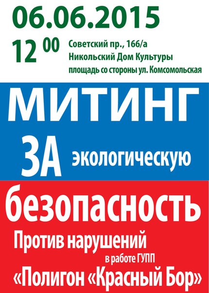Цель митинга: выражение общественного мнения в поддержку политики Президента РФ Путина В.В. по обеспечению экологической безопасности страны, предотвращение нарушений в работе ГУПП ”Полигон “Красный Бор”