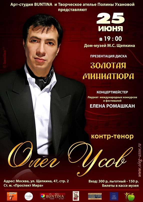 Арт-студия Екатерины Бунтиной и Творческое ателье Полины Ухановой приглашают Вас на презентацию нового диска обладателя уникального контр-тенора, известного исполнителя ОЛЕГА УСОВА «ЗОЛОТАЯ МИНИАТЮРА».