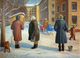 Всё это – в зеркале разных эпох русской истории минувшего столетия, которое мы прошли все вместе: периода кризиса веры, эпохи послевоенного наследия, безвременья 1970-80-х гг. Пронзительная тоска провинциального русского города, и рядом – удивительные натюрморты, где бурное цветение почти всегда соседствует с увяданием и распадом. Полотна Людмилы Бушмелёвой как будто ведут нас от конца 1960-х гг., и прямо до самого конца 2000-х годов. Как назвать её живопись? Может быть, «наивный реализм»?