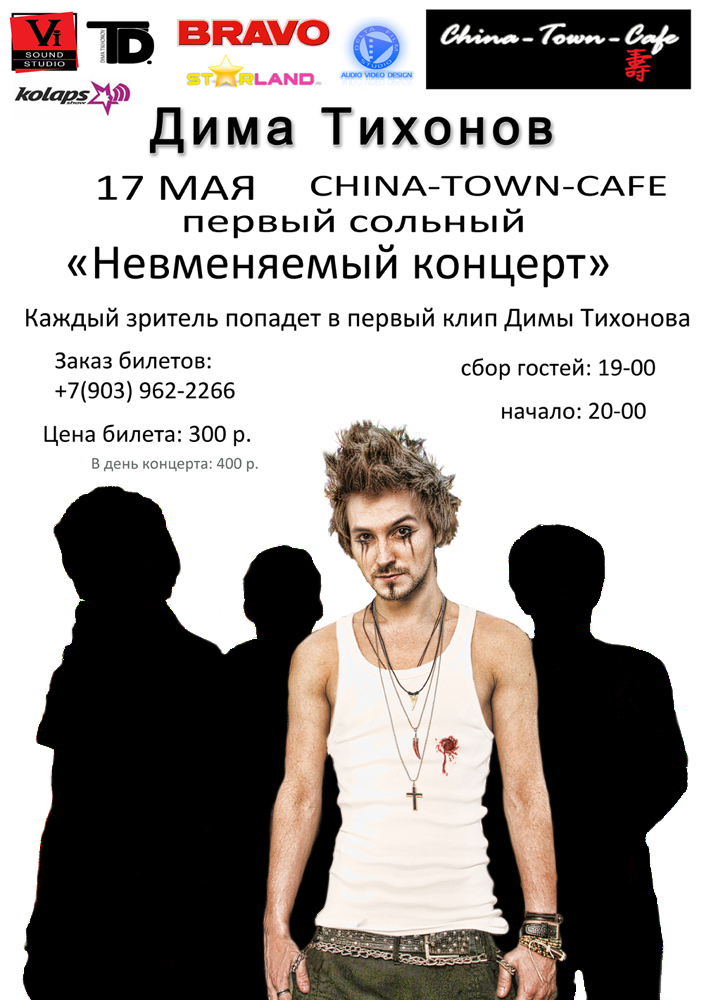 17 мая в клубе Chine-Town-Café состоится первый сольный концерт Димы Тихонова. Презентация программы «Невменяемый» пройдёт в живом исполнении с музыкантами и представит публике абсолютную премьеру новых песен.