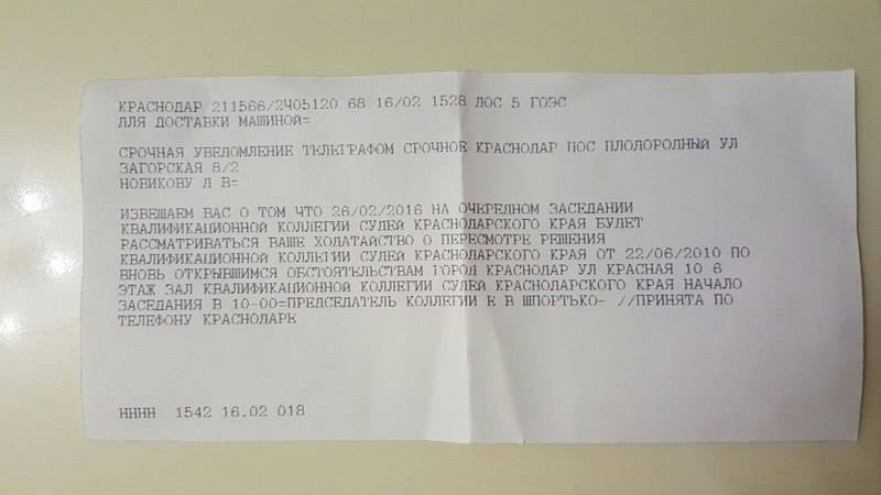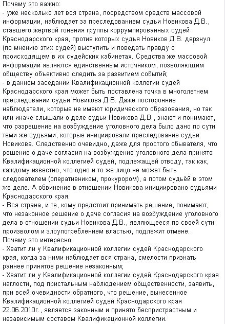Приглашаем Вас посетить заседание Квалификационной коллегии судей Краснодарского края, в котором будет рассматриваться вопрос об отмене по вновь открывшимся обстоятельствам решения Квалификационной коллегии судей Краснодарского края от 22.06.2010г. о даче согласия на возбуждение уголовного дела в отношении федерального судьи Новикова Дмитрия Владимировича.