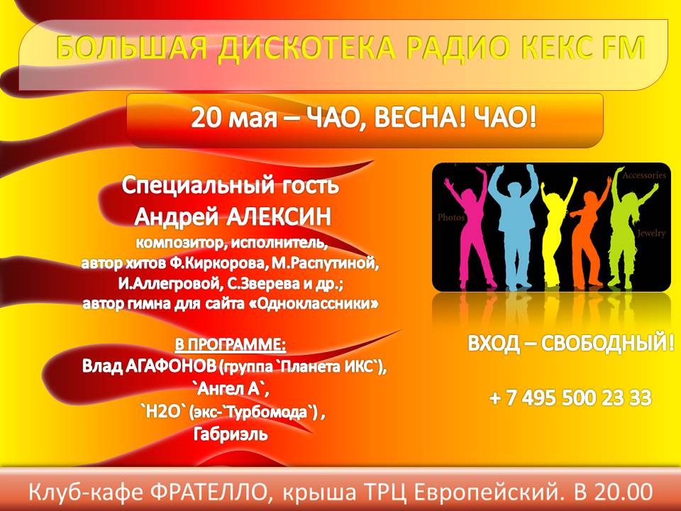 Лето календарное семимильными шагами приближается к Москве. Но пока еще цветет черемуха белая и метет вишневая метель, радио КЕКС FM и клуб-кафе ФРАТЕЛЛО приглашают принять участие в грандиозном, но последнем, Весеннем диско-мобберовско-клаберовском party – ЧАО, ВЕСНА! ЧАО!