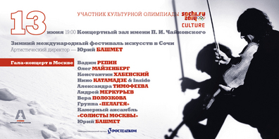 В этот вечер зрителей ожидает большое событие. Ставший уже знаменитым Фестиваль искусств в Сочи, артистическим директором которого является всемирно известный маэстро Юрий Башмет, представит в Москве лучшие номера сочинского фестиваля искусств разных лет.