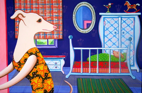 Второй художник, представленный на выставке – наша современница – Ольга Волгина-Эппле (род. 1975 г.). Ее работы, созданные акриловыми красками – стильные и современные, женственные и ироничные, имеют разные источники вдохновения – графика Пикассо и американского поп-арта, плакатное и дизайнерское творчество. Она подхватывает и развивает традицию московского концептуализма. Работы, построенные на контрастах локальных цветов, имеющие четкие контуры красочных пятен, часто складываются в серии с иносказательным ассоциативно-смысловым подтекстом. Изображение признанных буржуазных ценностей – собачек и прочих знаков гламурного достатка, балансирует между кичем и восхищением от полноты жизни, вибрируют радостным счастьем, приглашая зрителя погрузится в гедонистический рай… Главной концептуальной линией Волгиной–Эппле является идея неразрывной связи совместного существования людей, животных, вещей, непрерывной круговерти бытия.