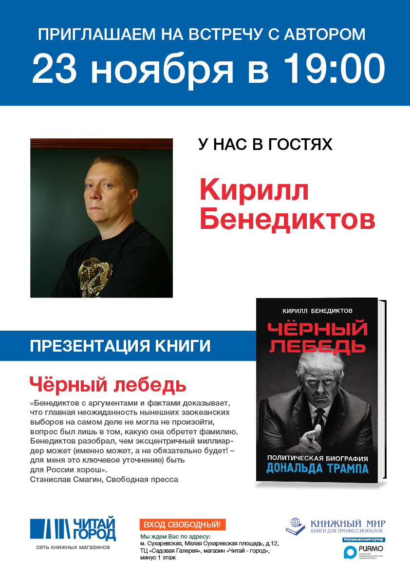 Приходите на встречу с Кириллом Бенедиктовым, и вы узнаете много нового не только о личности Трампа, но и о современной Америке, её закулисных, политических интригах.