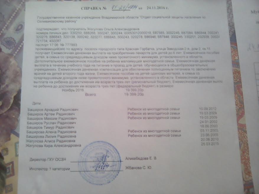 Бывший муж не платит алименты и скрывается в другом городе, а судебные приставы не прикладывают усилий к его поимке, несмотря на возбужденное дело. Ольга официально нигде не работает, да и не имеет такой возможности т.к. очень много дел дома. На многочисленные ее обращения к губернатору и уполномоченному по правам ребенка во Владимирской области Ольга получила лишь отписки, что всё положенное ей государством она получает. Хотя и эти ничтожно малые суммы были немотивированно и несправедливо сокращены в 2016 году. Так власти Владимирской области не выплачивают пособие по уходу за ребенком после достижения им 1,5 лет, хотя обязаны выплачивать до 3 лет. И величина этого пособия снизилась на 600 рублей. 24 ноября Ольга 6-х своих детей отдала в приют , потому что их нечем кормить. 29 ноября ей надо будет отдать и старших мальчишек , и маленькую Киру чужим людям . А самой ехать работать , чтобы долги отдавать. Дети даже не вместе будут , потому что приюты переполнены и их уже разделили. Двое в одном , двое в другом , четверо вместе , а маленькую самую одну отправят в Муром.
