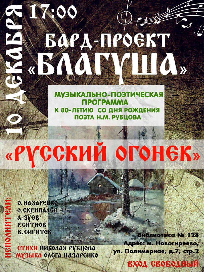 "Бард-проект "Благуша" - это содружество творческих людей, которых объединяет любовь к русскому Слову и русской Песне. Мы исполняем песни написанные нами на стихи русских поэтов и на стихи собственного сочинения. Программа "Русский огонёк" состоит из песен написанных на стихи Великого русского поэта Н.М. Рубцова.