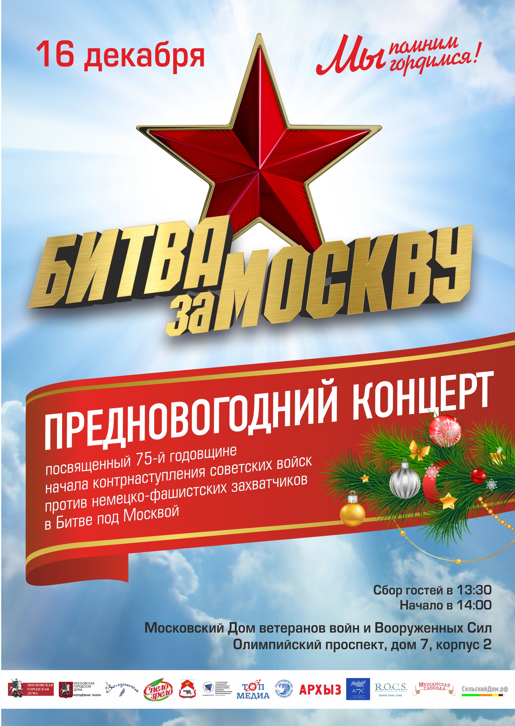 Секция по культуре и массовым коммуникациям Молодежной Палаты при Московской Городской Думе и Благотворительный фонд «Золушка» проведут концерт, посвященный этой памятной дате. Победа советских войск под Москвой имела огромное значение – впервые во Второй мировой войне немецкая армия была остановлена и потерпела весомое поражение. Праздничный концерт «Битва за Москву» – ещё один повод вспомнить героев той войны и сказать им спасибо.