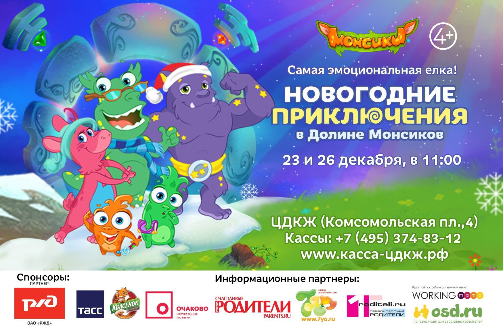 Елка с Монсиками_Пресс-релиз_Анонс.docx Скачать файл23 декабря 2016 года в 12:00 в Центральном доме культуры железнодорожников (ЦДКЖ) состоится самая эмоциональная елка – «Новогодние приключения в Долине Монсиков». Это удивительный спектакль, который подарит детям не только эмоции, но и поспособствует развитию эмоционального интеллекта (EQ)! Дети научатся понимать свои и чужие эмоции, быть смелыми и находить выход из любой ситуации!