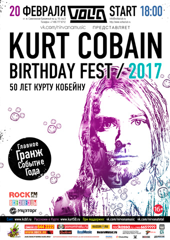 В феврале 2017 года Курту Кобейну исполнилось бы 50 лет. В честь этой, безусловно, важнейшей даты мы приготовили огромное количество сюрпризов и специальных гостей, которые заставят запомнить этот вечер надолго! 20 февраля в клубе Volta мы ждём всех любителей гранж-музыки на главном фестивале в честь дня рождения лидера группы Nirvana.