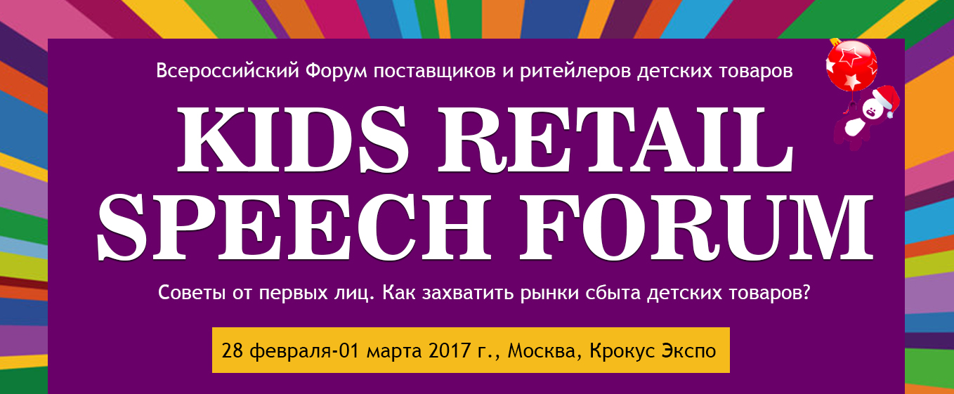 Программа Форума Kids Retail Speech.pdf Скачать файлС 28 февраля по 1 марта в МВЦ «Крокус Экспо» в Москве состоится Всероссийский Форум поставщиков и ритейлеров детских товаров Kids Retail Speech 2017: «Советы от первых лиц. Как захватить рынки сбыта детских товаров?». Форум пройдет в рамках Международной специализированной выставки товаров для детей Kids Russia. Организатором выступает компания Quorum совместно с «Гранд-Экспо».