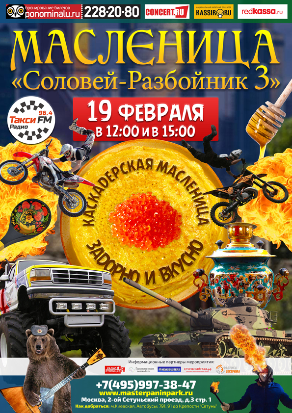 Каскадерская масленица – это завораживающий трюковой спектакль, молодецкие забавы и конкурсы, огромные блины и чай на травах, катание на квадроциклах и на Печке Емели.