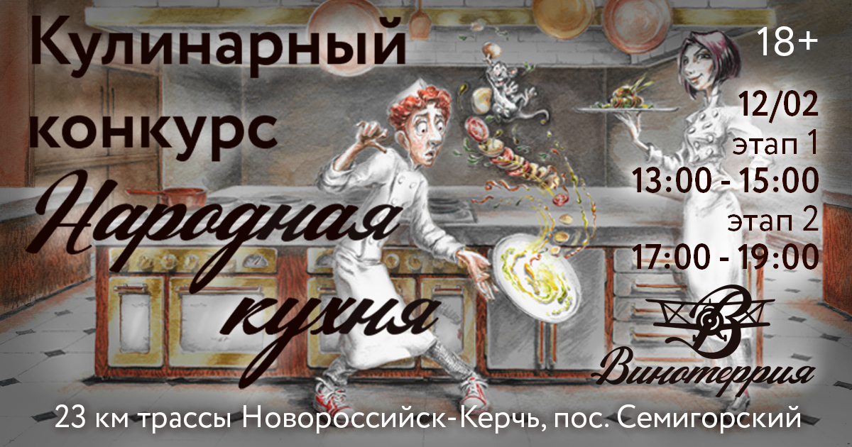 Пресс-релиз Народная кухня Винотеррия февраль 2017 (1).docx Скачать файлРесторан «Винотеррия приглашает Вас принять участие в социокультурном проекте «Народная кухня», который состоится с 10 по 12 февраля по адресу: 23 км трассы Новороссийск-Анапа, поселок Семигорский, ресторан «Винотеррия».