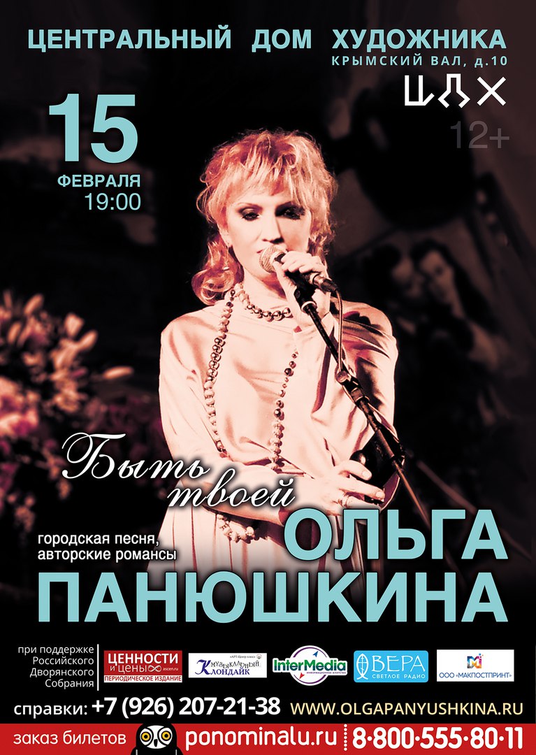 Ольга Панюшкина – композитор, поэт, певица, выпускница дирижёрско-хорового факультета Российской Академии Музыки имени Гнесиных, артистка Красногорской филармонии, Заслуженный работник культуры Монголии, лауреат фестиваля фестивалей «ЛиФФт», международных литературно-музыкальных фестивалей «Славянские традиции», «Интеллигентный сезон» и Всероссийского фестиваля «Русский Лад»".15 февраля в Центральном Доме Художника даёт сольный концерт, в котором прозвучат романсы из её альбома «А что такое звук души?..», городская песня из альбома «Вишня-Черешня» и новые песни на стихи Марины Цветаевой. В концерте примет участие акустический коллектив в составе: Евгений Баженов - фортепиано, Максим Сомов – контрабас, Василий Колода - перкуссия). Специальные гости: цыганский ансамбль под управлением Николая Васильева и казачий ансамбль солистов «Широкий Дон».
