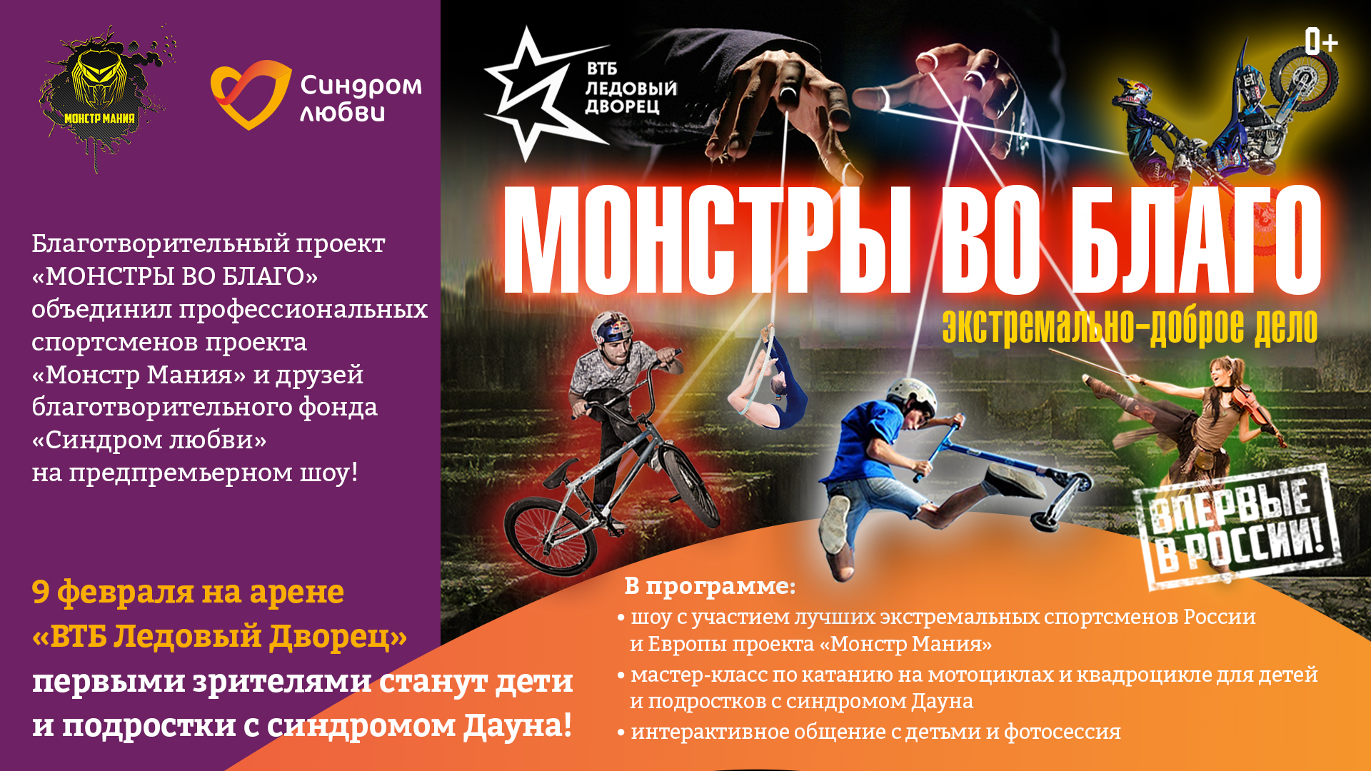 За два дня до премьеры спектакля «Игры Монстров» с участием лучших экстремальных спортсменов России и Европы, звезды грандиозного и захватывающего шоу приглашают в гости детей и подростков с синдромом Дауна, чтобы подарить им настоящий праздник.