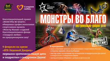 «Монстры во благо» - это прекрасная возможность совместить приятное с полезным: подарить своему ребенку незабываемые впечатления и поддержать доброе дело личным участием. Приглашаем Вас присоединиться и принять участие в этом добром спортивном мероприятии, приходите и приводите на праздник своих детей, чтобы их горящие после представления глаза помогли понять, как много для ребенка значит участие в таком приключении. И насколько такие яркие праздники важны для детей и подростков с синдромом Дауна. Мероприятие не имеет возрастных ограничений и рекомендовано к просмотру взрослым и детям.