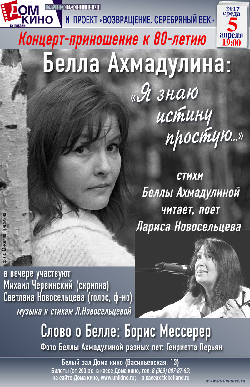 Адрес: Васильевская, 13 (м. Белорусская-кольцевая). Билеты уже продаются в кассе Дома кино (тел. кассы 8(969)087-87-95) и онлайн - через сайт Дома (прямая ссылка: Апрель - месяц Беллы Ахмадулиной. В этом году исполняется 80 лет со дня ее рождения, и этому юбилею посвящен большой концерт-приношение БЕЛЛА АХМАДУЛИНА: “Я знаю истину простую…”, который проводят Центральный дом кинематографистов и проект “Возвращение. Серебряный век”. Вечер пройдет в Белом зале Дома кино в среду 5 апреля,.