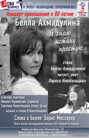 Прозвучат стихи, песни и романсы на стихи Беллы Ахмадулиной, фрагменты прозы и писем, ее посвящения Пушкину, Лермонтову, поэтам Серебряного века, друзьям - поэтам 60-х, стихи о Грузии и переводы с грузинского. Читает и поет Лариса Новосельцева, при участии Михаила Червинского (скрипка), Светланы Новосельцевой (голос, ф-но). Музыка к стихам Л.Новосельцевой. Слово о Белле скажет на вечере Борис Мессерер.