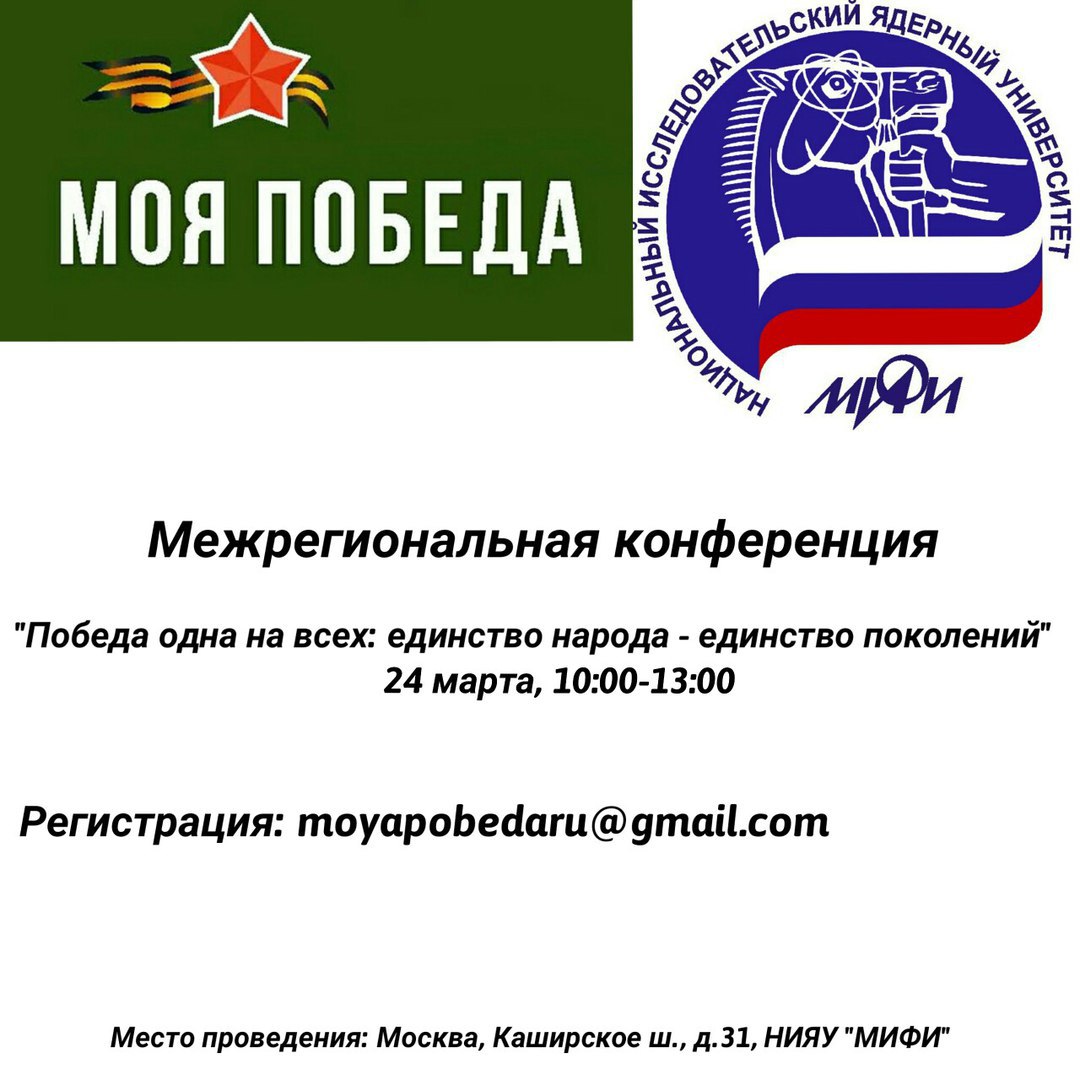 пресс-рел 24 марта_Моя Победа.docx Скачать файл24 марта в Национальном исследовательском ядерном университете «МИФИ» в рамках Информационно-просветительской кампании «Моя Победа» пройдет межрегиональная конференция на тему: «Победа одна на всех: единство народа - единство поколений».
