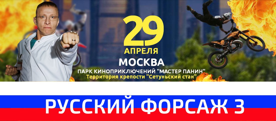 На территории парка киноприключений «Мастер Панин» пройдет нашумевшее шоу каскадеров «Русский Форсаж», где прямо на глазах у зрителей каскадерами будут исполнены самые сложные и зрелищные эпизоды голливудских блокбастеров.
