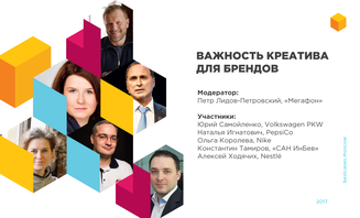 Рекламодатели также примут участие в отдельной дискуссионной панели «Важность креатива для брендов», где представители известных российских и международных компаний – Volkswagen PKW, PepsiCo, АО «САН ИнБев», Nestlé, Nike, – обсудят задачи брендов при создании рекламных кампаний, эффективность кейсов и метрики KPI, нюансы работы с агентствами и технологии, которые привлекают клиентов. Завершит дискуссию жаркий баттл «Бюджет VS Креатив», где станет известен ответ на главный вопрос: что важнее для создания ярких и, главное, эффективных проектов. Модератор панели: Петр Лидов-Петровский, PR-директор «Мегафон».
