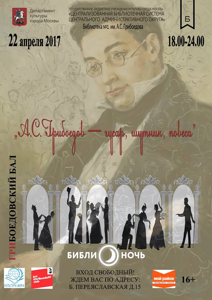 Анонс Г Бал.docx Скачать файлВсероссийская акция БИБЛИОНОЧЬ-2017. В библиотеке №1 имени А.С. Грибоедова Культурный фонд имени А.С.Грибоедова проводит Библионочь «А.С.Грибоедов — гусар, шутник, повеса» и первый Грибоедовский бал.