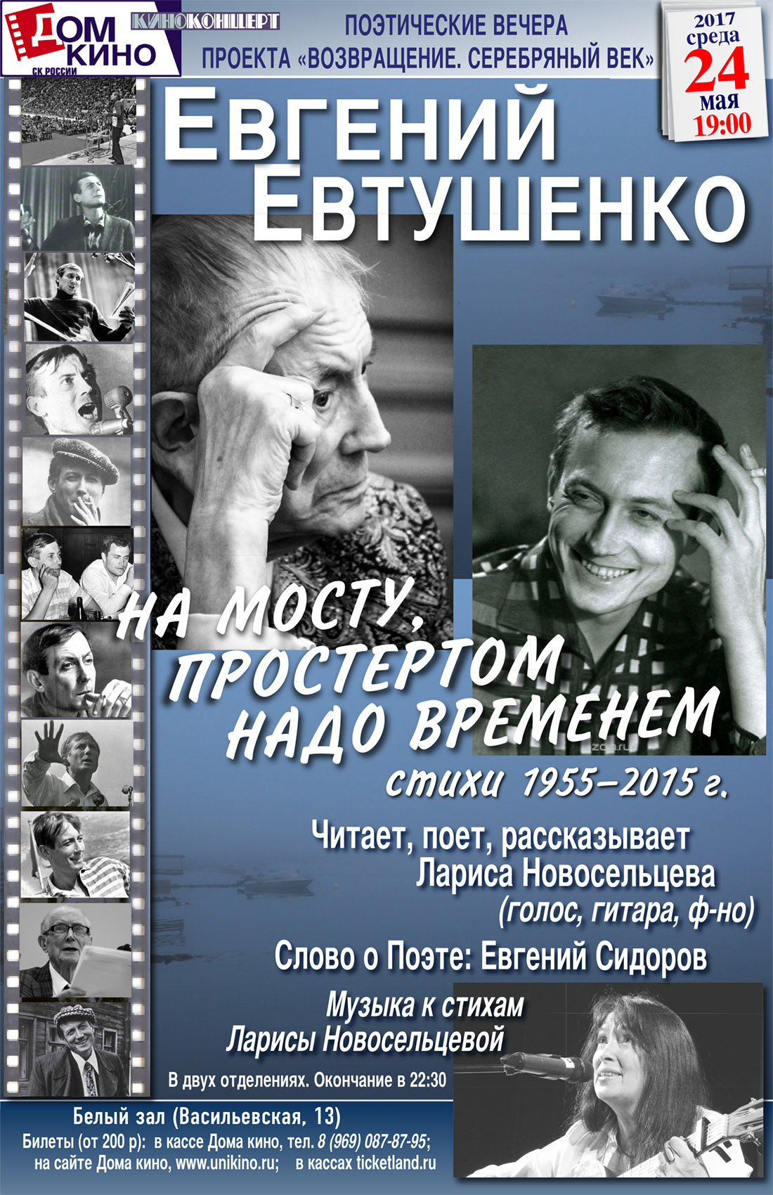 Билеты (200-800 р.) в кассе Дома кино (тел. кассы 8(969)087-87-95) и онлайн - через сайт Дома www.unikino.ru/anons, а также на ticketland.ru (https://www.ticketland.ru/koncertnye-zaly/dom-kino/evgeniy-evtushenko-na-mostu-prostertom-nado-vremenem/) и в других кассах города.