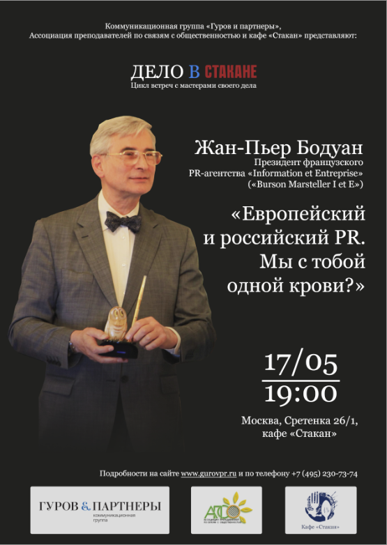 «Дело в стакане» – это совместный проект коммуникационной группы «Гуров и партнеры», Ассоциации преподавателей по связям с общественностью (АПСО) и кафе «Стакан». Проект состоит из цикла встреч с мастерами своего дела. В этот раз своими опытом и мастерством поделится классик европейского PR – Жан-Пьер Бодуан. Тема беседы – «Европейский и российский PR. Мы с тобой одной крови?».