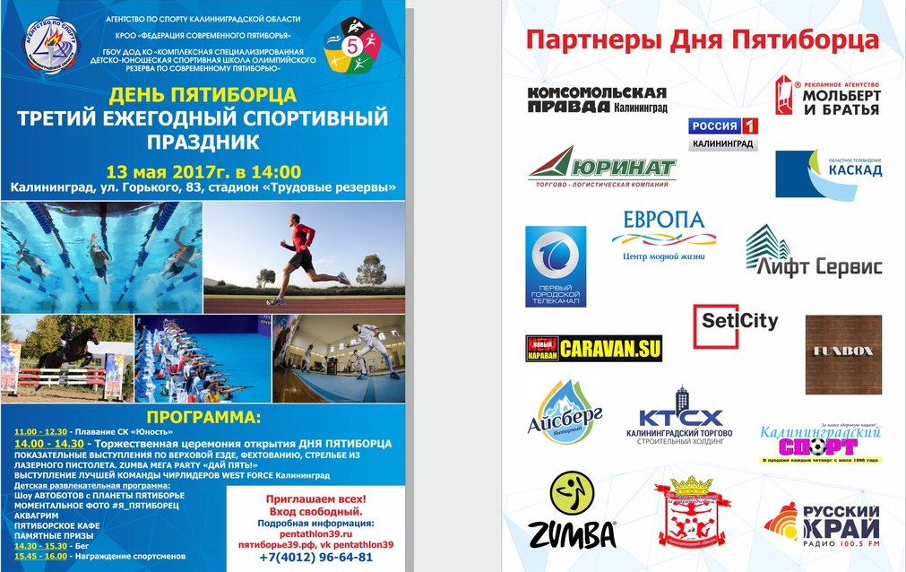 «Соревновательная программа максимально ориентирована на зрителя. В этом году ДЕНЬ ПЯТИБОРЦА будет представлять собой симбиоз классических состязаний и шоу-программы, планируется параллельная работа интерактивных площадок. Состязания представляют собой показательные выступления, в которых может принять участие любой желающий. Мы приглашаем всех. Откройте Вашим детям большой мир спорта!», − отметил президент Федерации современного пятиборья Калининградской области Артур Крупин.