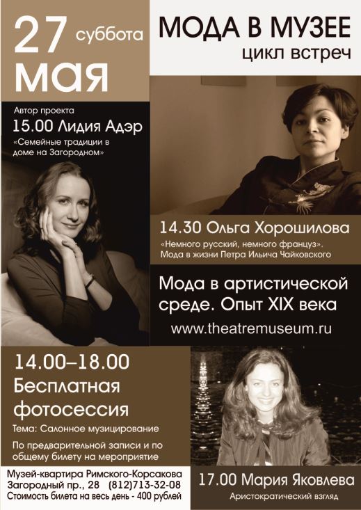 Музей-квартира Н. А. Римского-Корсакова начинает проект «Мода в Музее», посвященный не просто искусству, а искусству жить. Как носить бороду, какие шляпы годятся на разные случаи жизни, что такое верх изящества и благопристойности в модном костюме, как заваривать кофе и какой чай подавать гостям дома? Животрепещущие вопросы повседневного быта по-разному решаются в XIX и XXI веках. Но уроки старого стиля, несомненно, будут полезны и современным любителям «жить красиво». В квартире на Загородном проспекте, где семья композитора Н. А. Римского-Корсакова прожила 15 лет, среди тщательно восстановленных интерьеров и в окружении подлинных предметов быта, пройдет серия лекций историков моды, мастер-классов, дегустаций и фотосессий. Каждый модный день будет посвящен одному аспекту жизни семьи, которая стала воплощением петербургского стиля.