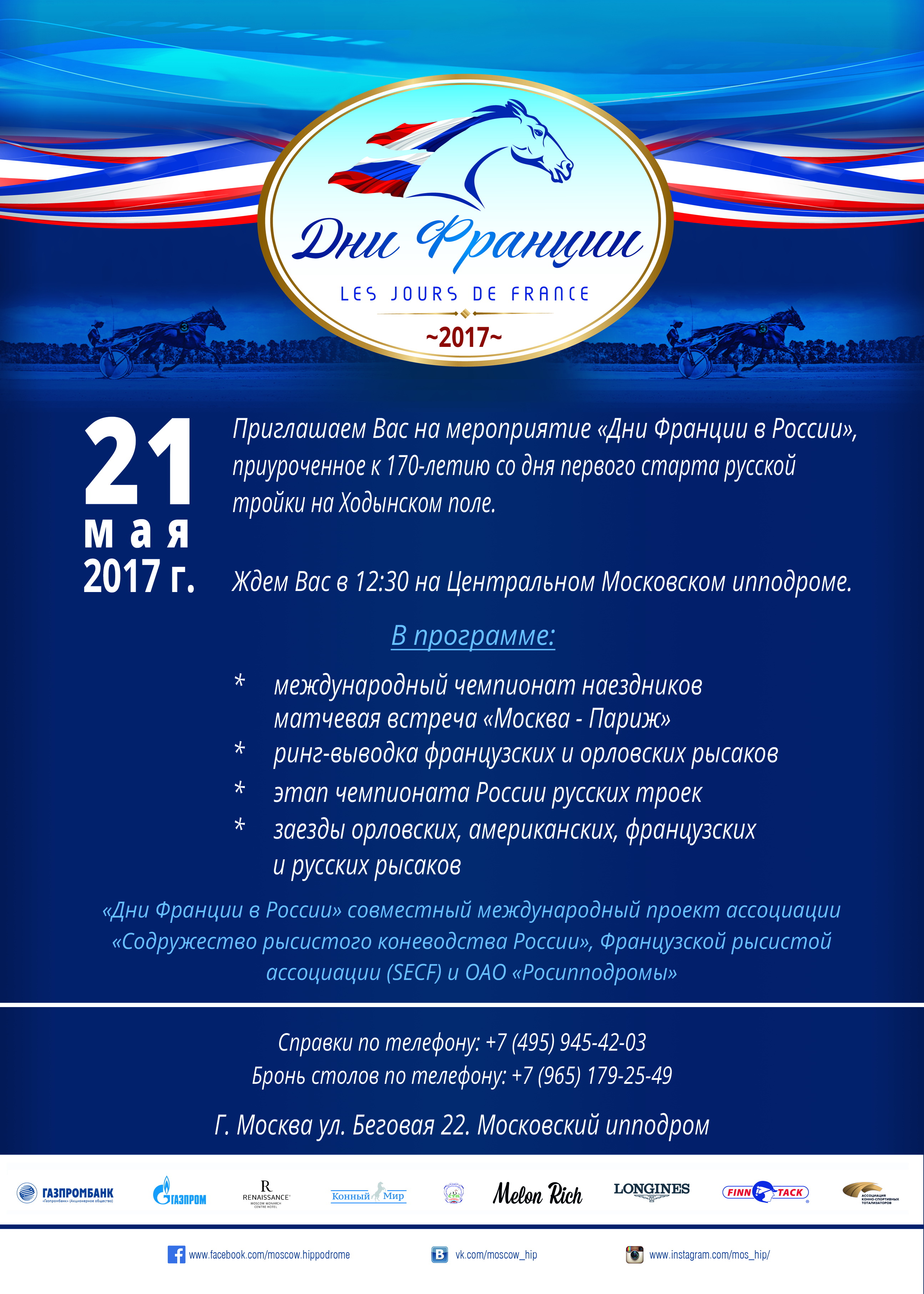 В этот день на Центральном Московском ипподроме пройдут три традиционных для этого праздника заезда для орловских рысаков – приз Парижа, Франции, в честь Французской Рысистой Ассоциации (SECF), для французских рысаков - в честь президента SECF графа Доминика де Беллега, первый летний этап XVIII Чемпионата России русских троек, ринг-выводка орловских и французских рысаков - участников «Дней Франции».