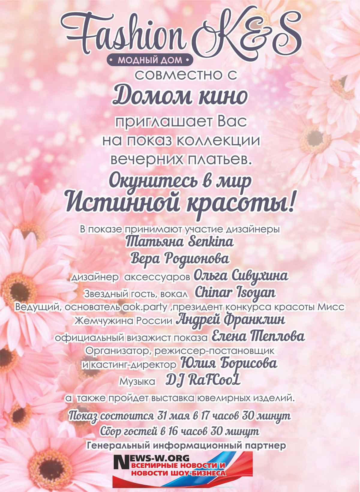 Показ Модного Дома Fashion K&S - это возможность продемонстрировать органичность и красоту обычной женщины немодельных параметров. Для этого на показ были приглашены прекрасные девушки из различных сфер бизнеса: актрисы, певицы, модели, врачи, бухгалтеры и т.д. Таким образом, дизайнер Татьяна Senkina желала подчеркнуть, что в каждой женщине живет настоящая модель и актриса. Источником вдохновения и создания коллекции является цветок Альстрамерия. Это цветок символизирует благородство и в зависимости от цвета имеет свое значение.В коллекции хотелось воплотить шик каждой участницы, подчеркнуты достоинства девушек конструкцией и кроем. Обыграна коллекция специально из самых различных видов тканей, показана игра цвета и формы.