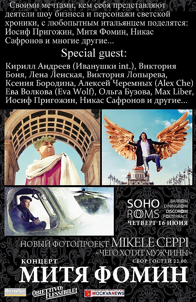 Своими мечтами с любопытным итальянцем поделились деятели шоу-бизнеса и персонажи светской хроники. Продюсер Иосиф Пригожин рассказал, что хотел бы примерить на себя образ римского императора. Певец Митя Фомин в детстве мечтал стать пилотом. Главный редактор журнала «Maxim» Александр Маленков не отказался бы от собственных крыльев. Силач Брюс Хлебников хочет познакомиться с Владимиром Путиным. Актер Иван Николаев жалеет, что не стал ветеринаром, а художник Никас Сафронов – пиратом.