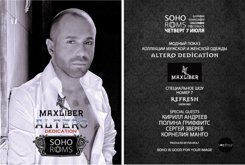 Рождённая в индустриальном городе и вдохновлённая урбанистическими мотивами для жителей современного мегаполиса и тех кто предпочитает уникальность во всём, а не только в стиле. Чтобы выглядеть и чувствовать себя рождённым в поднебесье и сошедшим на эту землю. Быть в центре внимания и не бояться выглядеть так, как говорит внутреннее Я, в этом специфика и уникальность одежды бренда «MAXLIBER». Музыкальное сопровождение новой коллекции от DJ Goodkov , который написал специальный сет для клуба Soho Rooms ,открывает шоу приглашённые для этого случая SHOW-MIX, после чего незабываемый показ коллекции «Altero Dedication».