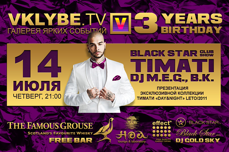Вас ждет самое правильное настроение от Black Star Club Show: TIMATI, DJ M.E.G., B.K., праздничный сет от DJ Gold Sky, показ экcклюзивной коллекции от Тимати "Day&Night" LETO 2011 и много-много Famous Grouse Scotland's Favourite Whisky и ваших друзей!