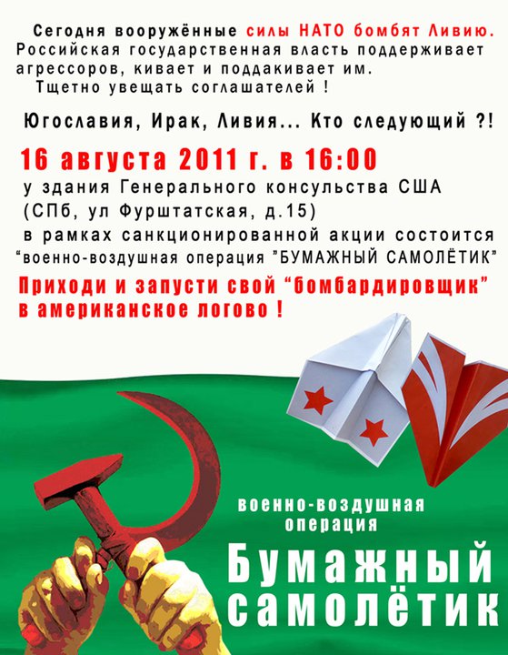 В случае отказа американцев, по истечении отпущенного на размышление срока, начинается массовая «бомбардировка» здания американского консульства цветными бумажными самолётиками. Всё серьёзно – мы их предупреждали ! Также предлагаем всем прохожим присоединиться к «военно-воздушной операции» и запустить свой «бомбардировщик» в представительство агрессивной державы.