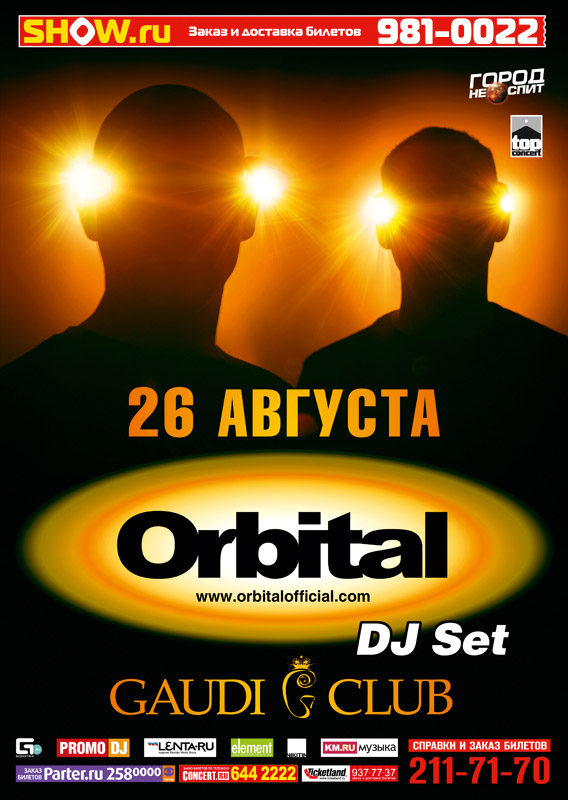 Пришествие ORBITAL в Москву не станет исключением из правил. Специально для этого в Gaudi Club будет установлен гигантский светодиодный экран. Таким образом, сцена Gaudi Club по требованию группы будет специально расширена, чтобы вместить всё техническое оснащение готовящегося выступления. Второй год подряд ORBITAL выступают на легендарном фестивале Glastonbury в Англии. В программе сета в Москве прозвучат лучшие хиты команды и треки с нового альбома, над записью которого в данный момент работают музыканты.