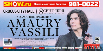 Самый молодой профессиональный тенор мира, голос Франции на Евровидении, 21-летний Amaury Vassili представит в Москве свою программу. Amaury Vassili – молодая звезда классической музыки. Ему рукоплещут лучшие залы мира, его таланту поклоняются ценители музыки, его красота разбивает сердца молодёжи. Обладая кристально чистым вокалом и аристократической утончённостью, Amaury Vassili представляет традиции Старого Света. В то же время, таинственный и немного мистический образ певца притягивает к нему внимание молодой аудитории, воспитанной западной культурой. Этот симбиоз классики и актуального имиджа позволяет Amaury собирать в одном зале людей разных поколений и эстетических взглядов, объединяя их энергией своего голоса и обаяния.
