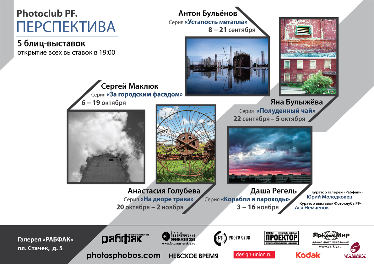 Photoclub PF совместно с галереей Рабфак с сентября по ноябрь проводит пять блиц-выставок молодых авторов - членов фотоклуба PF (каждая продлится 2-е недели). Известные петербургские фотографы Ася Немчёнок - куратор творческой лаборатории Photoclub PF и Юрий Молодковец - куратор галереи Рабфак, приглашают всех горожан прийти и выразить свое мнение – проголосовать, кто из 5-и представленных молодых авторов, выпускников школы фотографии «Петербургские фотомастерские», кажется им наиболее перспективным, кто, по их мнению, станет в будущем настоящим фотохудожником?